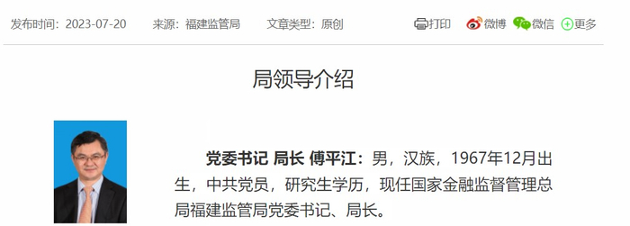 傅平江,国家金融监督管理总局福建监管局党委书记、局长。在调任福建前,他曾在浙江、海南等地任职。2019年4月,在浙江银监系统任职长达10年的傅平江出任海南银保监局党委书记、局长。
