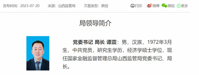 谭震任金融监督管理总局山西监管局党委书记、局长。现年51岁的谭震曾先后在广东、辽宁任职。简历显示,在赴任辽宁前,谭震曾先后任广东银监局党委委员、副局长,广东银保监局筹备组成员,广东银保监局党委委员、副局长。