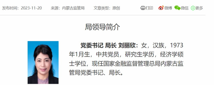 刘丽欣, 国家金融监管总局山西监管局原党委副书记、副局长刘丽欣升任内蒙古监管局党委书记、局长。公开信息显示,刘丽欣曾于2016年9月担任原黑龙江银监局党委委员、副局长;2018年11月,出任原黑龙江银保监局党委委员;此后,刘丽欣从黑龙江调到山。