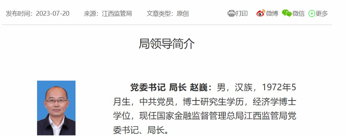 赵巍,金融监管总局江西监管局党委书记、局长,原金融监管总局新疆监管局党委书记、局长,1972年5月生。公开资料显示,赵巍曾在中共中央宣传部、中共中央金融工作委员会、中国银监会、中国证监会、中国保监会工作。