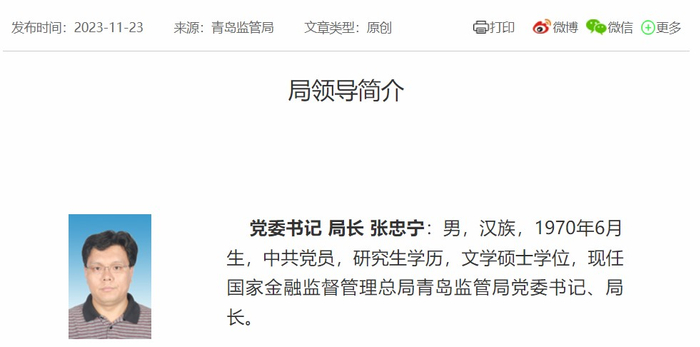 张忠宁,出任青岛监管局党委书记、局长。公开资料显示,2000年,张忠宁进入原中国保监会工作,先后任办公厅新闻宣传处副处长、处长;2013年9月至2014年10月,挂职任山东省菏泽市政府党组成员、副市长;银保监会成立后,担任办公厅副主任、新闻发言人;监管体系改革后,担任国家金融监管总局办公厅副主任。
