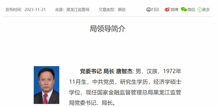唐智杰任黑龙江监管局党委书记、局长。唐智杰出生于1972年11月,简历显示,唐智杰曾任宁夏监管局党委书记、局长,在调任宁夏前为原湖南银保监局副局长。任湖南银保监局副局长期间,唐智杰分管农村中小银行机构监管处、新型农村金融机构监管处、财务会计处工作。