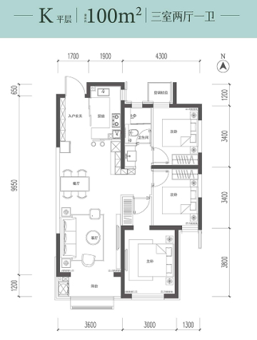 100㎡的户型,打造出三居,更符合当代有孩家庭的上班族。整个户型方正有型,动线明确,空间利用率极高,是刚需人群最喜欢的户型设计与面积。