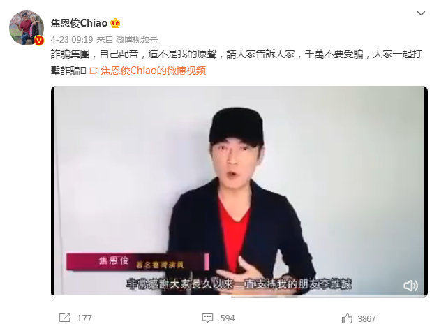 今年4月23日,演员焦恩俊发微博,直接打假网上流传的一段所谓“焦恩俊为某活动送祝福”的视频,视频中画面虽然是焦恩俊本人,但是却并非他的原音,并呼吁大家“千万不要受骗,大家一起打击诈骗”。