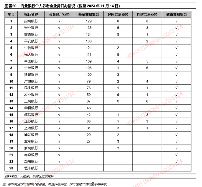 1)商业银行:全流程参与个人养老金业务,业务范围广。其中,①资金账户业务(账户开立或指定、注销、变更和个人养老金缴费、领取、划转等),②个人养老储蓄业务(参加人仅可购买其本人资金账户开户行所发行的储蓄存款和特定养老储蓄存款产品),③个人养老金产品代销业务(包括个人养老金理财产品、保险产品、公募基金产品),④个人养老金咨询业务。