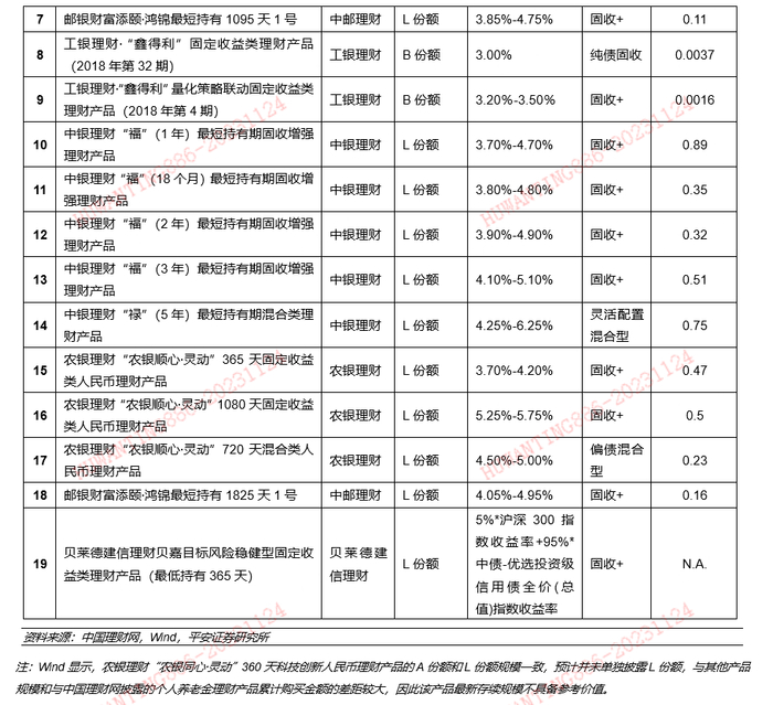 5)从业绩比较基准来看:平均约4.0%-5.0%。以中银理财为例,个人养老金理财产品L份额的业绩比较基准上下限较同一理财产品A份额均高0.1pct以上。