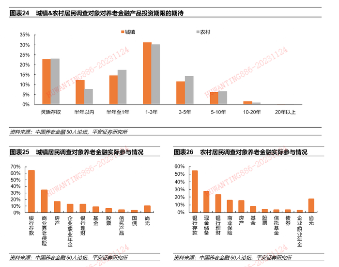 中国养老金融50⼈论坛发布的2022年调查研究报告显示,我国城乡居民调查对象普遍参与养老金融,也普遍有意愿进行养老财富储备,目前实际参与和储备意愿都最偏好和信任银行存款,同时对保险、银行理财等多元化产品保持一定关注。调查对象中,约80%居民期待的养老金融产品投资期限主要以3年以内产品为主,仅有不到8%的居民选择投资期限5年以上的产品、选择投资期限10年以上金融产品的居民占比仅堪堪高于1%。因此,总体来看,居民对养老金融产品的需求主要集中于5年及以下中短期稳健产品。长期来看,随着居民收入的增长,居民养老储蓄意愿将持续落地,个人养老金产品发展空间尚较大。但居民养老金融风险偏好较低,调查对象普遍认为目前养老金融产品种类较少、收益率偏低、介绍不够清晰明确,在有限的选择内,主要关注银行存款、商业保险、银行理财等相对稳健且以保值为主的产品,养老金融需求有待进一步释放。
