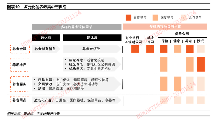 养老需求涵盖老年人的衣食住行,主要包括财富积累与传承、日常居住和生活起居、医疗照护的保障和改善等。因此,从需求出发,养老产业分为养老金融、养老地产、养老服务(包括医疗健康、文娱等)和养老用品(适老化实体产品)四大组成部分。其中,养老金融聚焦于养老金积累和保值增值等管理,养老地产、养老服务和养老用品属于养老金消费。养老金融主要包括第一支柱基本养老金、第二支柱企业/职业年金和第三支柱的个人养老金账户、个人商业保险、个人储蓄等。