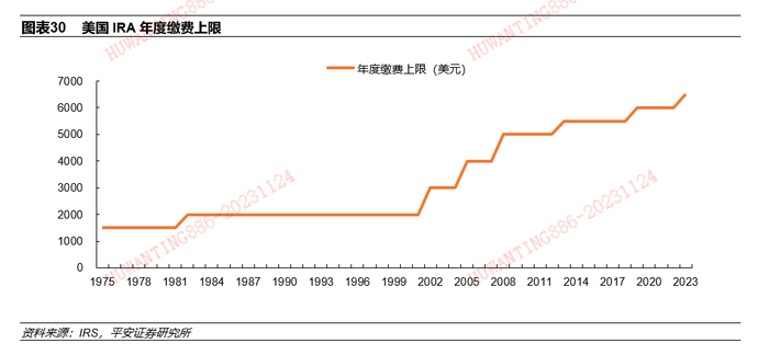 1)未来可以缓步提升个人养老金税优限额。参考美国,IRA年度缴费上限在发展初期基本保持不变,2000年以来才加快上限提升节奏,总体进程并不快。同时,提高税优限额可能导致高收入人群享受的税优力度更大,也面临公平性的问题。