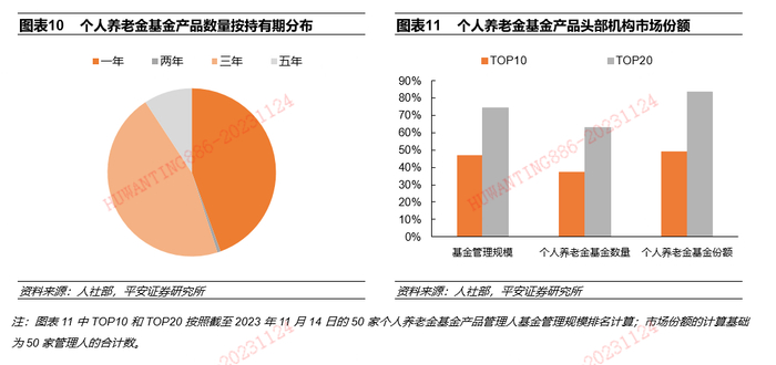 2)基金产品:50家公募基金公司提供162款产品,以持有期为一年和三年的基金产品为主,入围基金公司以大中型公司为主、马太效应显著。根据AMAC,2022年11月18日发布的首批个人养老金基金名录纳入40家基金公司旗下的129只养老目标基金产品;截至2023年11月14日,人社部披露的个人养老金基金名录共计50家公募基金公司提供162款产品;其中,持有期为一年、二年、三年、五年的基金产品分别72款、1款、74款、15款,持有期为一年和三年的基金产品合计占比90.1%,是个人养老金基金的主力产品。50家个人养老金基金产品管理人的基金管理规模在行业198家基金公司的整体基金管理规模中占比高达84.0%,以大中型机构为主,也呈现出头部机构规模效应显著、市场份额集中的特征。具体来看:基金管理规模排名TOP10机构的基金管理规模、个人养老金基金产品数量和基金份额的市场份额分别为46.9%、37.0%、49.2%;排名TOP20的市场份额分别为74.3%、63.0%、83.5%,基金份额较产品数量的市场集中度更高。