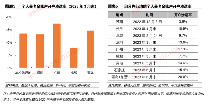 开立个人养老金账户人数稳步增长,但增速放缓、在参保人群的渗透率不高。根据人社部披露,截至2022年末,开立个人养老金账户的人数(简称“开户数”)为1954万人,全国基本养老保险参保人数约10.5亿人、36个先行地基本养老保险参保人数约2.5亿人,全国和36个先行地的开户渗透率分别1.9%、7.9%。截至2023年3月末,开户数约3324万人(QoQ+70.1%),全国和36个先行地的开户渗透率分别3.2%、13.4%;截至6月末,开户数约4030万人(QoQ+21.2%),全国和36个先行地的开户渗透率分别3.8%、16.3%。