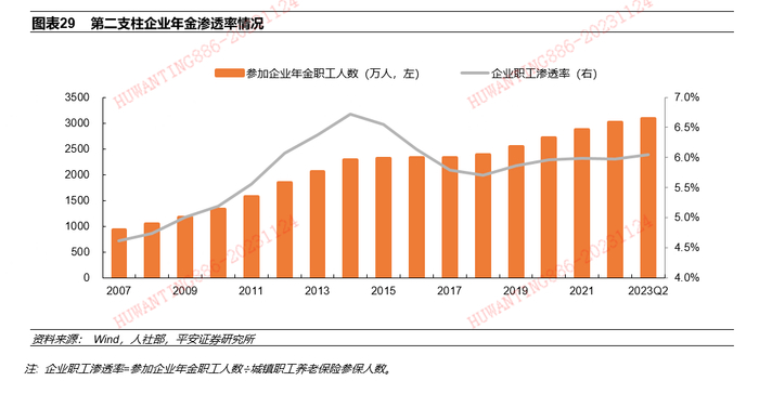 尽管面临难点与挑战,但与企业年金相比,个人养老金发展已较快。2000年,企业补充养老保险正式更名为企业年金,企业年金开始试点,成为养老保险体系的三大支柱之一;2014年1月《企业年金试行办法》颁布,企业年金开始全面推行。截至2023年二季度末,我国建立企业年金基金的企业数量为13.6万家,参与职工3084.6万人;企业年金职工渗透率仅6.05%。2022年末,企业法人单位中,建立企业年金的单位占比仅0.4%。尽管已发展数十年,但企业年金发展仍较为缓慢、渗透率偏低。截至2023年6月末,36个先行地的个人养老金开户渗透率约16.3%,远高于企业年金(6.05%)。