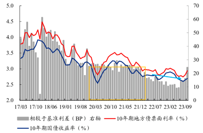 从发行利率来看,2023年10月,受地方债供给冲击影响,再融资债发行中标利差有所回升。以10年期地方债为例,2020年以来,地方债发行利率相较于国债到期收益率的利差稳定在25BPs左右,自2022年以来利差有所下移,一段时间内部分品种发行利差曾落到10-15BPs;而2023年10月,受特殊再融资债供给冲击的扰动,10年期地方债平均利差回升到24BPs左右。