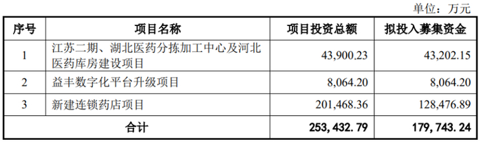 据悉,本次募集资金投资项目总投资额为 25.34 亿元,用于“江苏二期、湖北医药分拣加工中心及河北医药库房建设项目”“益丰数字化平台升级项目”“新建连锁药店项目”“补充流动资金项目”。