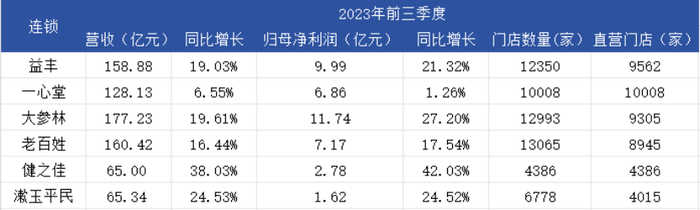 与此同时,健之佳,大参林,老百姓,漱玉平民等头部连锁上市公司相继发布2023三季度报告。