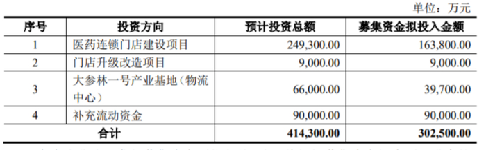 根据益丰药房此前披露的《向不特定对象发行可转换公司债券之证券募集说明书(上会稿)》显示,拟投入4.32亿元用于“江苏二期、湖北医药分拣加工中心及河北医药库房建设项目”、拟投入0.81亿元用于“益丰数字化平台升级项目”;另外,“新建连锁药店项目”拟投入金额最大,为12.85亿元,该项目的总投资金额为20.15亿元,此次发行可转债拟募资不超过17.97亿元。