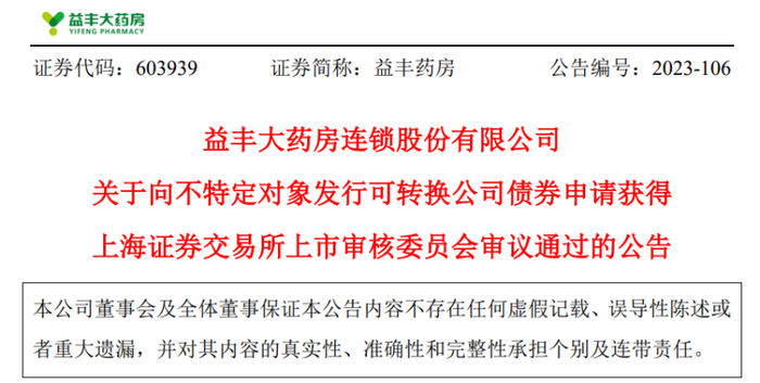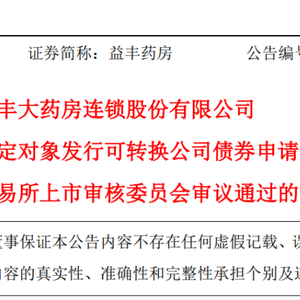 近日,益丰药房发布公告,根据会议审议结果,公司本次向不特定对象发行可转换公司债券的申请符合发行条件、上市条件和信息披露要求。