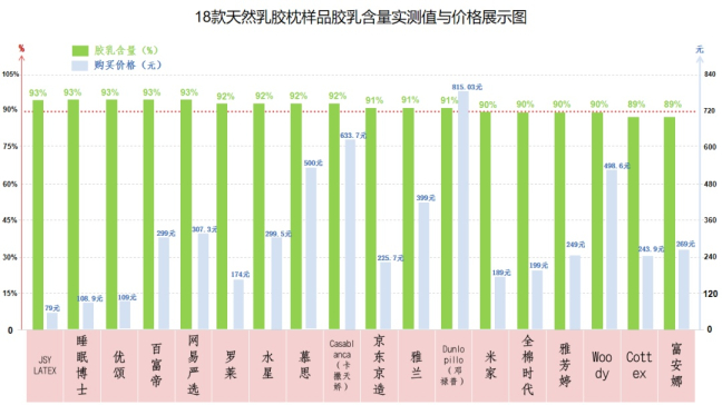 测评工作人员认为,乳胶枕生产工艺决定了其一般均含有一定量的发泡助剂(添加剂),胶乳含量为100%的天然乳胶枕是不存在的。从测试结果可看出,较好的乳胶枕其天然乳胶含量在88%—93%之间,因此,消费者不必一味追求更高含量的乳胶枕。