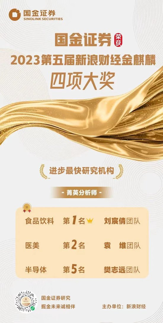 11月24日,由新浪财经主办的“2023分析师大会暨第五届新浪财经金麒麟最佳分析师颁奖盛典”在上海盛大举行。在这次评选中,国金证券荣获了“进步最快研究机构”奖,以及“菁英分析师”奖。其中,国金证券的食品饮料研究团队荣获了食品饮料研究领域的第一名,医药研究团队获得了医美行业行业研究的第二名,电子研究团队则获得了半导体行业的第五名。