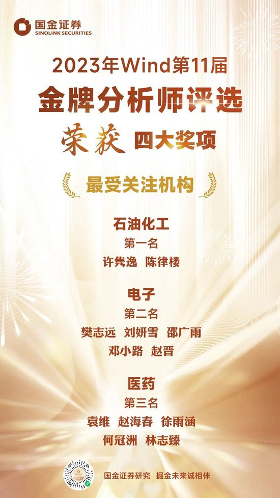 11月20日,2023年第十一届Wind“金牌分析师”评选结果也正式揭晓。国金证券在这次评选中同样表现出色,荣获了“最受关注机构”奖,并在石油石化、电子和医药三个研究领域获得了第一、第二和第三名。