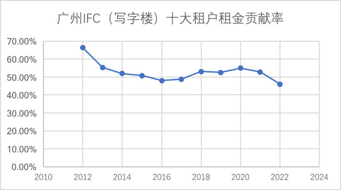 与此同时,国金中心(写字楼)租户集中度也在不断降低,十大租户租金贡献率从2012年时的近七成降到2022年不到五成。