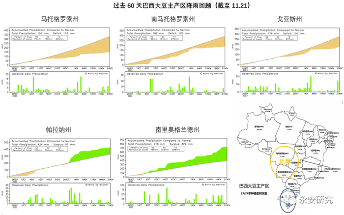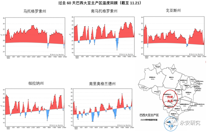 通过上面2附图可以看出,从9月中旬即2023/2024年度巴西大豆开始播种至今,巴西北部及中部大豆主产区持续处于少雨高温的状态,中南部大豆主产区先是降雨不足之后降雨偏多,南部大豆主产区持续处于降雨偏多的状态。因此,在厄尔尼诺天气的影响下,今年巴西大豆在播种阶段主产区整体处于北旱南涝且北部和中部持续高温的状态。