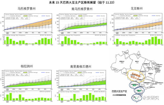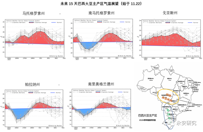 通过上面2附图可以看出,未来15天巴西大豆主产区降雨整体有所增加,高温情况也有所缓解,但是不同主产州差别依旧较为明显。北部的主产州马托格罗索和中部戈亚斯降雨依旧不足温度也持续偏高,南马托格罗索州降雨增加同时高温情况也有所改善,帕拉纳州和南里奥格兰德降雨持续偏多温度高低交错。根据未来15天天气预报进行分析,可以看到南马托格罗索州干旱少雨的情况有望有所改善,但是马托格罗索和戈亚斯依旧需要更多的降雨,帕拉纳州和南里奥格兰德州依旧洪涝持续。