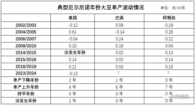 根据这个统计方法,在过去的25年里一共有7年发生了典型的厄尔尼诺现象。在7个典型厄尔尼诺现象的年份里:美豆有2年里出现了单产下滑的现象,有4年发生了单产上调的现象;巴西有1年里出现了单产下滑的现象,有6年发生了单产上调的现象;阿根廷没有出现单产下滑的现象,有7年发生了单产上调的现象。