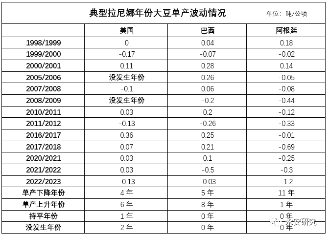 根据这个统计方法,在过去的25年里一共有13年发生了典型的拉尼娜现象。在13个典型拉尼娜现象的年份里:美豆有4年出现了单产下滑的现象,有6年发生了单产上调的现象;巴西有5年里出现了单产下滑的现象,有8年发生了单产上调的现象;阿根廷有11年里出现了单产下滑的现象,有1年发生了单产上调的现象。