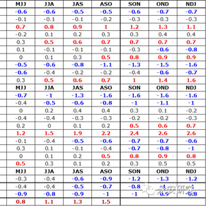 根据NOAA发布的ENSO周报中的定义显示:当ONI数值大于等于0.5ºC时为厄尔尼诺特征。根据以往历史的标准,当连续5个及以上ONI数值大于等于0.5ºC时,被定义为典型的发展成熟的厄尔尼诺现象;当ONI数值小于等于-0.5ºC时为拉尼娜特征。根据以往历史的标准,当连续5个及以上ONI数值小于等于0.5ºC时,被定义为典型的发展成熟的拉尼娜现象。