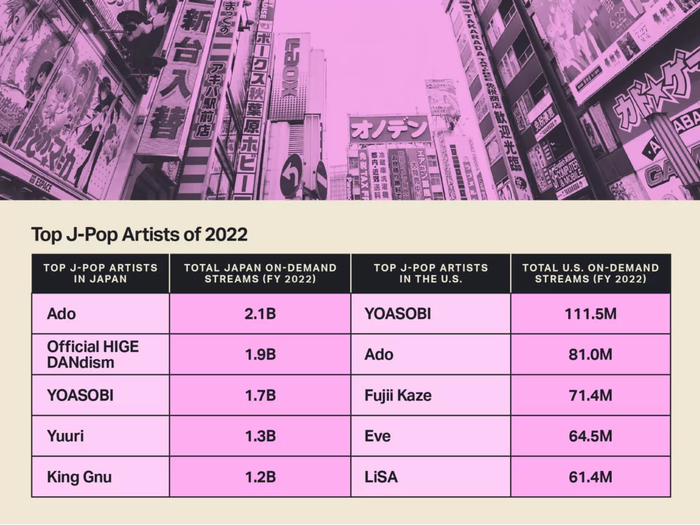 如果这还不够令人印象深刻,全球十大流媒体J-Pop艺人共获得173亿点播总流量(音频和视频),比2022年前十名增长了17.8%。