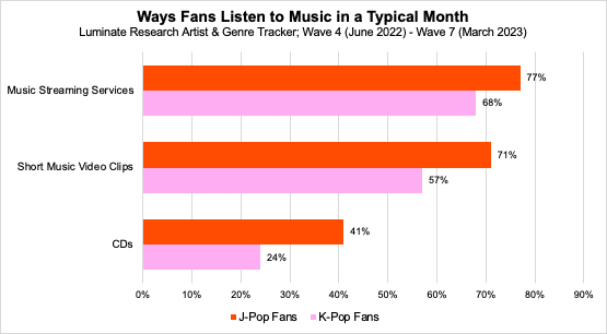 从下面的音乐形式渗透率图表可以看出,两种类型的粉丝都通过观看音乐视频片段或通过音乐流媒体服务或CD来大量消费音乐。J-Pop粉丝在每种音乐载体上的渗透率都超过了K-Pop粉丝,这再次表明了J-Pop粉丝对音乐的热情。