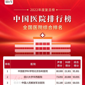 11月25日,复旦大学医院管理研究所作为独立第三方开展的公益性项目《2022年度中国医院综合排行榜》和《2022年度中国医院专科声誉排行榜》在上海发布。人民日报健康客户端梳理发现,自2014年起,北京协和医院、四川大学华西医院、中国人民解放军总医院稳居医院综合排行榜前三位。