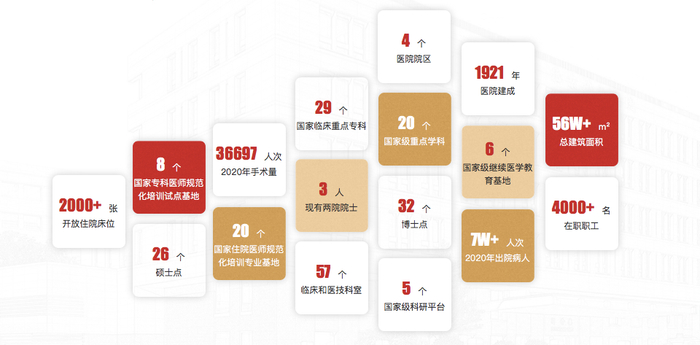 北京协和医院建成于1921年,是中国最早承担外宾医疗任务的单位,共有院区4个,两院院士3人,临床、医技和平台科室57个,国家级重点学科20个,国家临床重点专科29个,国家级科研平台5个,国家住院医师规范化培训专业基地20个,国家专科医师规范化培训试点基地8个,住院床位2000余张,2020全年手术量36697人次,年出院病人7万余人次。