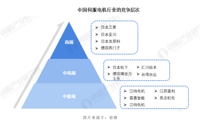 中国伺服系统市场主要分为日韩品牌、欧美品牌和中国品牌三大阵营,由于需要的技术水平较高,伺服系统市场一直为外资品牌主导。在2021年上半年时,中国品牌中,汇川技术首次市场份额占比排名第一,市占率达15.9%,其业务布局最广,伺服电机技术及工业也都处于中国领先水平。其他市场份额排名靠前的企业有日本三菱、日本安川和日本松下。中低端伺服电机方面,江特电机、江苏雷利、雷赛智能和昊志机电等公司有所布局。