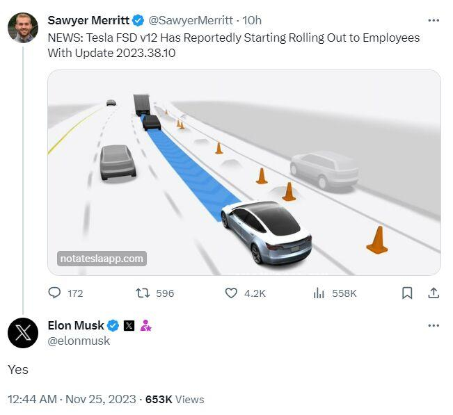 马斯克周六也在X上证实,特斯拉已开始向员工推送FSD V12更新。此前,仅工程测试团队可以使用。该步骤是进入客户车队之前的最后一步。因此,特斯拉看起来确实能够在今年年底前向客户推送更新。
