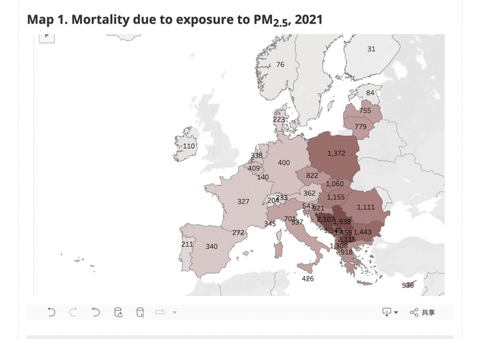 如果将范围扩大到欧洲40个国家,2021年,PM2.5污染相关死亡人数则为29.3万,二氧化氮相关死亡为6.9万,短期臭氧暴露相关死亡为2.7万。与前一年数据相比,PM2.5和二氧化氮引起的死亡率略有上升,短期臭氧暴露死亡率则有下降。