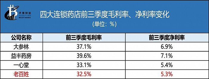 此外,国家药品带量采购联动降价等因素,令连锁药店的产品毛利率受到影响。老百姓前三季度中西成药毛利率较上年同期下滑了0.12个百分点,中药较上年同期下滑了1.21个百分点。