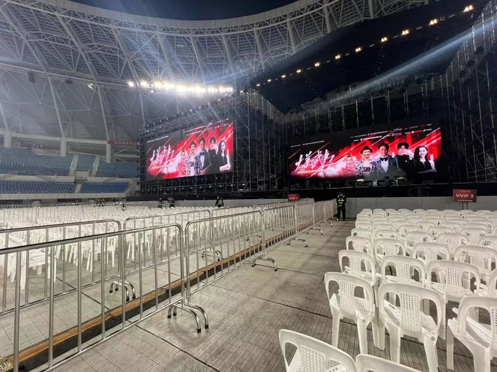 临近开场,体育馆才陆陆续续坐上人,应该也有八成的上座率,但很多人拿的都是赠票和折扣票。我们问了周围的人,有亲戚送的票,有单位送的票,就是没有买的。我旁边那个人是吃了饭才来的,还说晚上喝了点酒,身上还有酒气。现场也看到老年人。演出开始后,秩序也有点混乱,有人离开座位挤到前排,安保也不管。