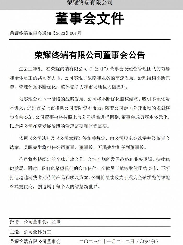 11月20日晚,一条重磅消息传出:原深圳市水务(集团)有限公司董事长吴晖已在上月加入荣耀终端有限公司,或将担任董事长一职。原荣耀董事长万飚,则被调整为副董事长。