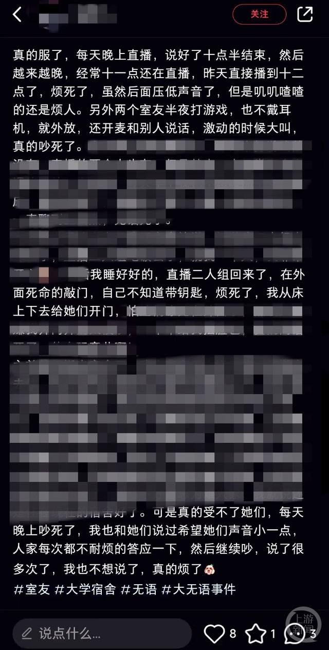 在某社交平台搜索“室友在宿舍直播”,记者发现超过50篇笔记都是有关大学生寝室直播引发室友不满:“每天晚上吵死了,我也和她们说过希望她们声音小一点,人家每次都不耐烦地答应一下,然后继续吵”“我觉得在寝室直播就是不合适啊,但是想不到什么严肃有效的理由让她不直播,求大家帮忙出谋划策一下”……