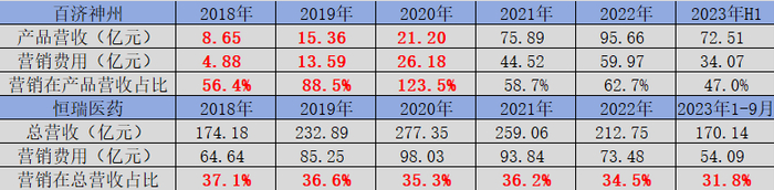 聚焦百济神州商业化初期的表现,其2018年依靠代理产品能够实现8.64亿元的营收,而营销费用为4.88亿元,营销费用占产品营收比重约为56.4%。这样的营销效率如何呢?通过与中国制药一哥恒瑞医药的对比就能知晓一二。