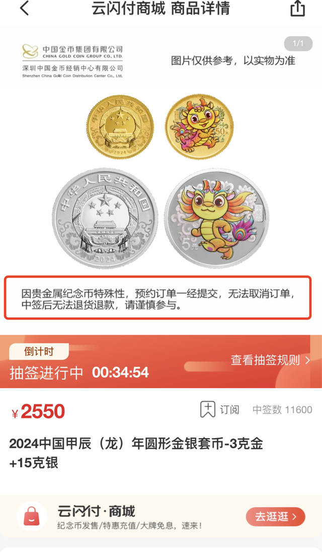 澎湃新闻记者看到,龙年纪念币预约界面上有提示:因重金属纪念币特殊性,预约订单一经提交,无法取消订单,中签后无法退货退款。“这个产品又没有什么定制性,而且是在预约阶段,为什么不能取消?这不是霸王条款吗?”邱女士称。