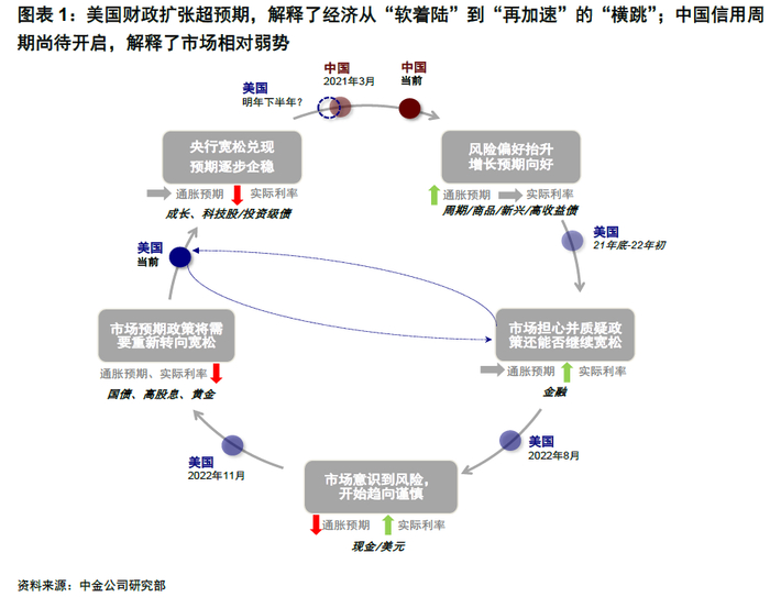 对于中国,美国紧财政+宽货币将部分缓解增长差和政策差的压力。美国增长放缓和加息压力缓解,都会给中国的利差、汇率和政策再宽松提供窗口,因为当前进一步降低长端和实际融资成本也将成为一个可用的提振增长手段。如果借这一窗口尽快推动财政扩张,也可以借此缩小增长差距。对资产而言,美债利率和美联储政策会提供一个央行政策和估值修复的喘息窗口,此时利率敏感行业或高弹性板块更为收益,如生物科技、科技硬件、新能源与互联网等。但在修复式反弹后和更大对症政策前,建议依然沿用攻守兼备的“哑铃”结构,高端科技、出海逻辑、长期分红能力是三条主线逻辑。