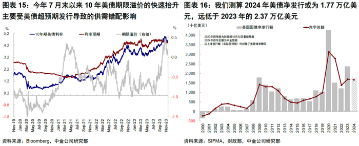 进一步,赤字回落和TGA回补完成也会减少2024年发债规模。三季度10年美债快速抬升主要受美债超预期发行导致的供需错配影响,期限溢价走高。财政赤字的减少,以及TGA回补完成(当前超过8000亿美元),我们预计2024年美债净发行或从今年的2.37万亿美元降至1.77万亿美元,部分缓解美债利率的压力。