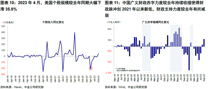 2023年美国财政超预期扩张,其中金融风险、财政收入回落和部分支出上升共同导致赤字扩张,也导致经济“加速”和美股、美元和美债利率的走强。中国在年初疫后经济快速修复后,财政脉冲转为快速收缩,主要因为财政收入抬升但支出受限,脉冲幅度和程度都超出预期。