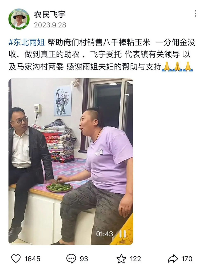 有团队不假,但雨姐也确实在助农。直播间里的产品基本上都是当地产的玉米、榛蘑、黑木耳、手工粉条。搜索雨姐的时候我发现,有一位农民还特意发抖音感谢过她,帮助村里销售了八千棒粘玉米,没有收一分钱佣金。