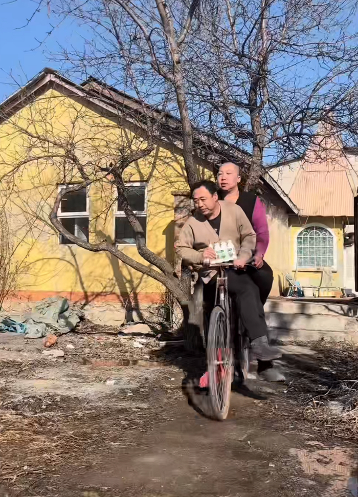 雨姐和老蒯就像辽宁本溪版《甜蜜蜜》。出门买菜,雨姐把老蒯放在车座前面;去干农活,雨姐拉车,老蒯和粮食一起坐在车上,还俏皮地摇晃双腿;雨姐洗菜炒菜,老蒯就躺在炕上一边逗猫一边喝AD钙奶。