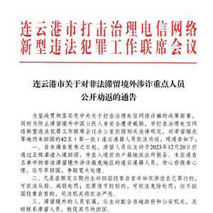 新京报讯(记者 张静姝)11月25日,新京报记者从江苏省连云港警方获悉,连云港市日前召开了打击治理电信网络新型违法犯罪工作联席会议,发布了《连云港市关于对非法滞留境外涉诈重点人员公开劝返的通告》。会议表示,为坚决贯彻落实党中央关于打击治理电信网络诈骗的决策部署,同时为防止滞留境外中国公民人身安全遭受威胁,连云港市打击治理电信网络新型违法犯罪工作联席会议办公室依据相关法律规定,对滞留缅北等地仍未回国的42名(第一批)连云港籍人员依法劝返。