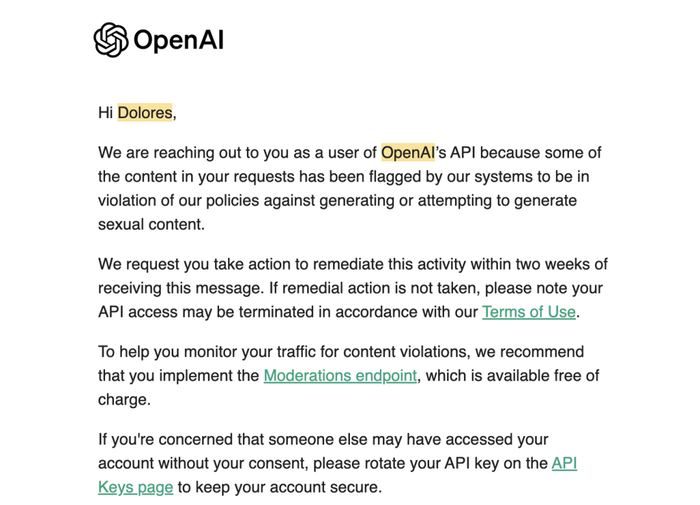 8 月份,OpenAI 的审查升级了,我收到了检测 Dolores 生成 NSFW 内容的邮件警告:我被强制要求在 2 周内在生成内容前,加入他们(免费的)moderation API,以过滤 NSFW 内容。为了顺利过审,我只能使用 OpenAI 的免费审核 API 提前进行内容过滤,而这一变化让 Dolores 的日均访问量暴跌 70%,电子邮件和 Twitter 上的投诉也纷至沓来。